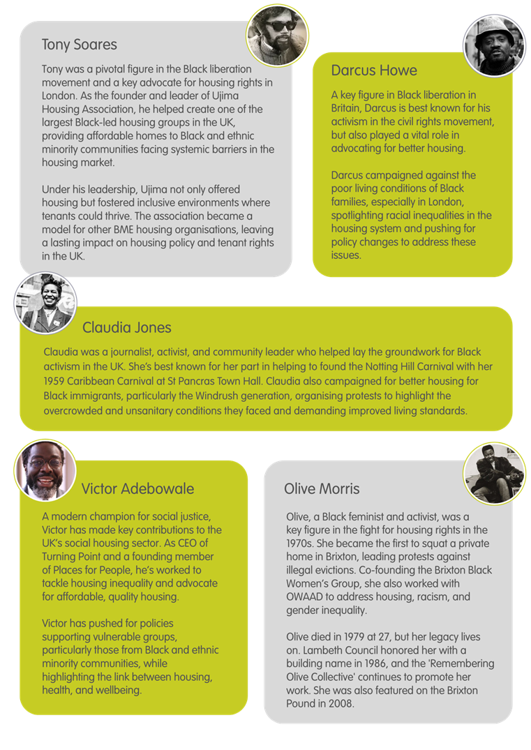 We acknowledge their contributions and recognise the need for change within the housing sector remains urgent. Their legacies continue to inspire ongoing efforts to ensure that everyone, regardless of their background has access to quality, secure housing.